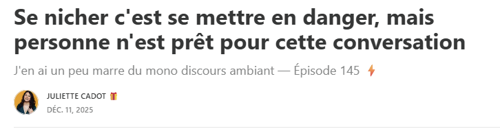 Autre exemple : la récente newsletter de Juliette Cadot 🎁 dans laquelle elle dénonce qu’elle appelle l’injonction au “nichage”.